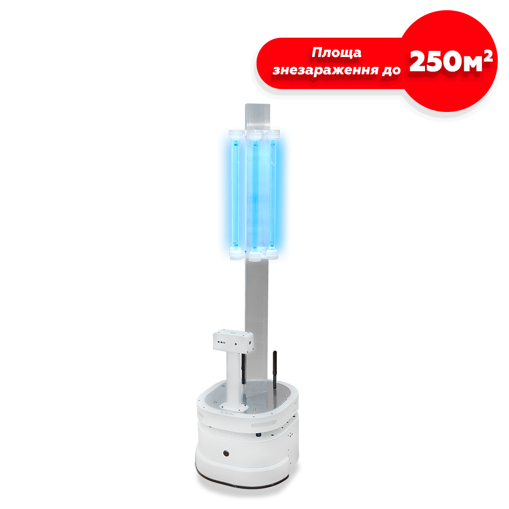 Робот АЕРЕКС БОТ Робот призначений для автоматичної стерилізації та дезінфекції в заданій зоні за допомогою УФламп низького тиску для знищення бактерій та інших шкідливих мікроорганізмів, що запобігає перехресній інфекції в зонах підвищеного риска. Робот самостійно пересувається для стерилізації в заданій мітками зоні та підтримує автономне енергозабезпечення. Коли заряд батарей малий, він повертається для заряджання, забезпечуючи безперервну роботу. Робот забезпечений тачсенсором, що забезпечує його безпечну експлуатацію. Роботи АЕРЕКС призначені для дезінфекції та стерилізації через руйнування інфраструктури ДНК усіх мікроорганізмів, запобігаючи та зменшуючи поширення вірусів, бактерій та інших шкідливих мікроорганізмів у навколишньому середовищі. Робот має два режими роботи: за допомогою циркуляції повітря та прямого випромінювання, яке підходить для різних умов і категорій приміщень. Робот підтримує автономне енергозабезпечення. Коли заряд батарей малий, він повертається для заряджання, забезпечуючи безперервну роботу